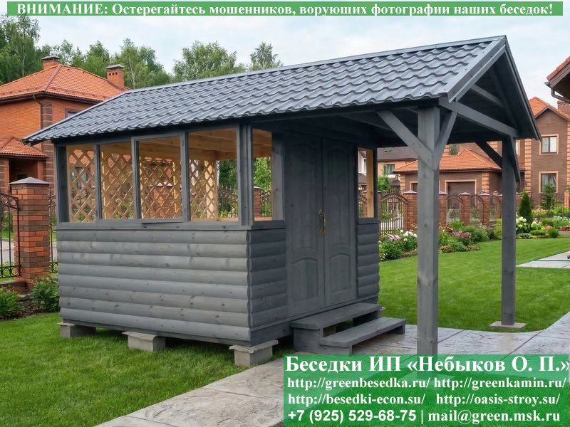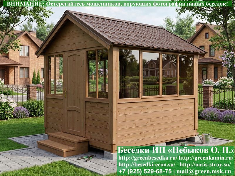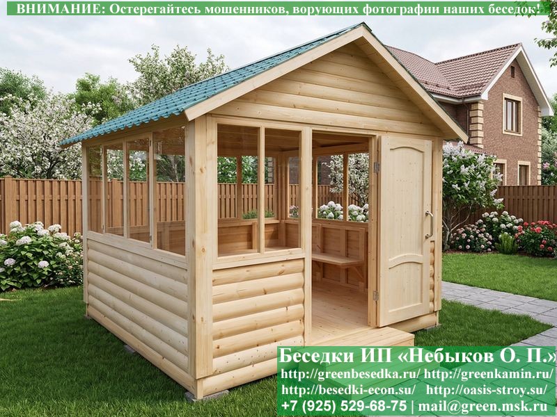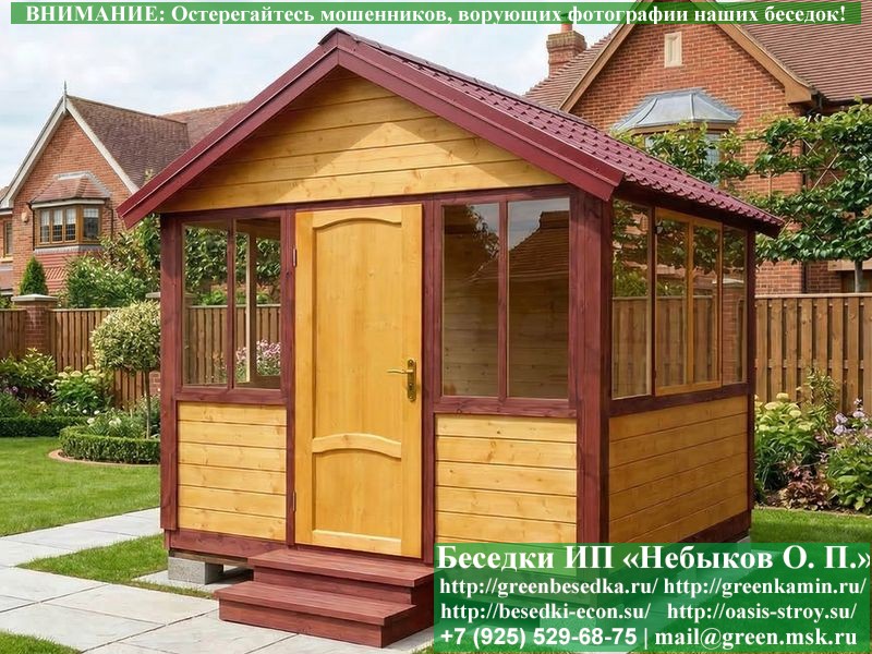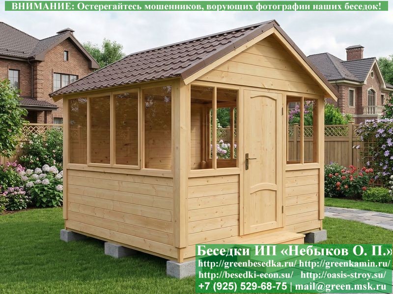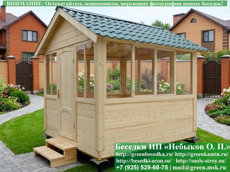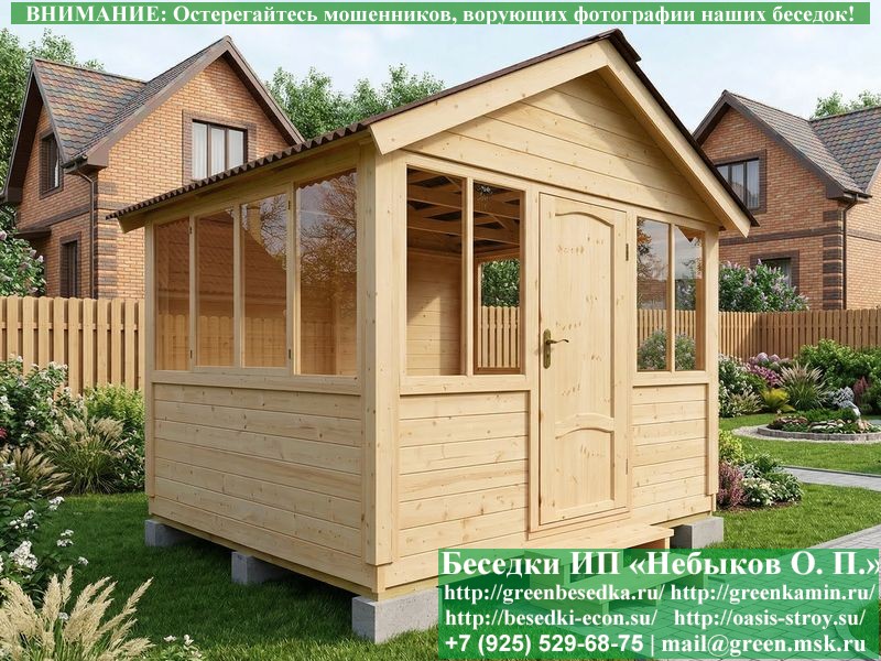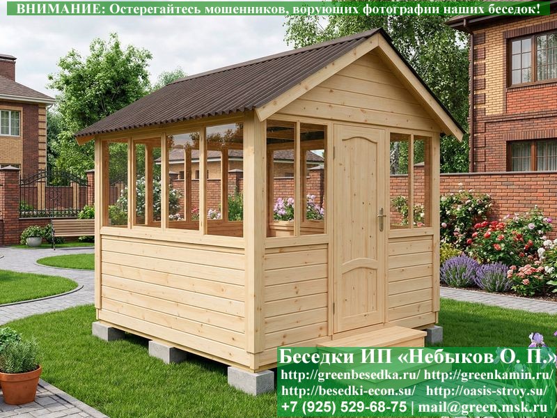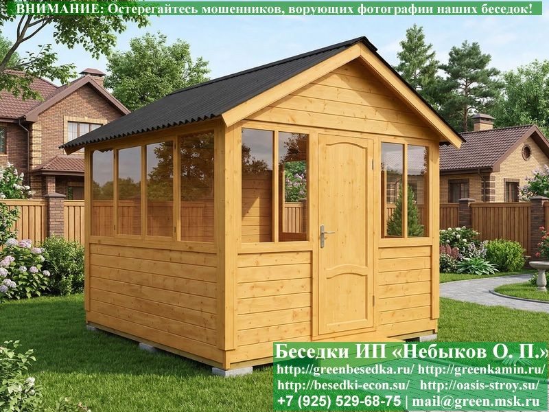 Закрытая застекленная беседка для дачи, загородного дома, сада 3х3 метра изготавливается из сосны. При строительстве беседок используется сухой материал камерной сушки. В качестве каркаса беседки используется очень надежная имитация бруса 17х140 мм. В отличие от вагонки ее не выгибает, она не набухает и не идет трещинами. Усиленная конструкция крепления стоек. По углам ставится дополнительный строганый брус 90х90 мм. В беседку устанавливаются однорамные террасные деревянные окна. Толщина стекла 3 мм. Высота окон 110 см. Устанавливается сплошная деревянная филенчатая дверь. Дверь закупается в Лемана-Про, гарантии не подлежит. Дверь можно заменить на металлическую или алюминиевую. Окна и двери поставляются без фурнитуры (ручки и замки). Их можно установить дополнительно, по договоренности. На крышу беседки укладывается ондулин: Коричневых, Зеленых и Бордовых цветов. Ондулин можно заменить на металлочерепицу, мягкую черепицу или профлист. Срок изготовления и монтажа беседки на участке составляет 5-10 дней. Беседки поставляются в не крашеном вид. Возможна покраска беседок цеху или полная обработка антисептиком. Строительство деревянных закрытых застекленных беседок размерами 3х3 метра возможно в Москве, Московской, Тверской, Тульской, Калужской, Ярославской, Владимирской, Рязанской, Ивановской, Брянской, Костромской, Орловской, Смоленской, Новгородской, Липецкой, Ленинградской и некоторых других областях. Дополнительно предлагаем установку в деревянные застекленные беседки недорогих безопасных быстровозводимых печей-барбекю, установка в течение дня, или более дорогих и сложных комплексов-барбекю и мангалов-барбекю из кирпича.