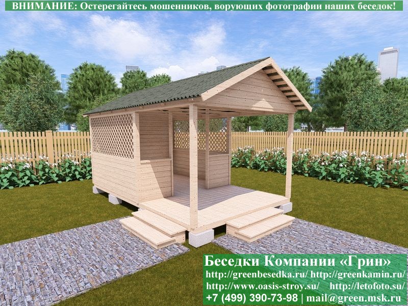 В стоимость входит беседка 3х3 без пергол перед входом и открытый навес 2х3. Прямоугольная садовая беседка 'Домик с навесом 3х5' изготавливается из сосны. При строительстве беседок используется сухой материал камерной сушки. В качестве каркаса используется очень надежная имитация бруса 17х140 мм. В отличие от вагонки она не гнется, не набухает и не идет трещинами. Используется усиленная конструкция крепления стенок. В качестве несущих стоек используется строганый брус, по углам 90х90 мм. На крышу беседки укладывается ондулин: Коричневых, Зеленых и Бордовых цветов. Срок изготовления и монтажа беседки на участке 5-10 дней. Беседки поставляются в не крашеном виде. Возможна покраска беседок краской, лаком или обработка цветным антисептиком (дешевый вариант). Строительство деревянных беседок с навесом размерами 3х5 метров возможно в Москве, Московской области, а так же в Тверской, Тульской, Калужской, Ярославской, Владимирской, Орловской, Костромской, Ивановской, Рязанской, Новгородской и некоторых других областях. Дополнительно предлагаем установку в деревянные беседки недорогих безопасных быстровозводимых печей-барбекю, установка в течение дня, или более дорогих и сложных комплексов-барбекю и мангалов-барбекю из кирпича.
