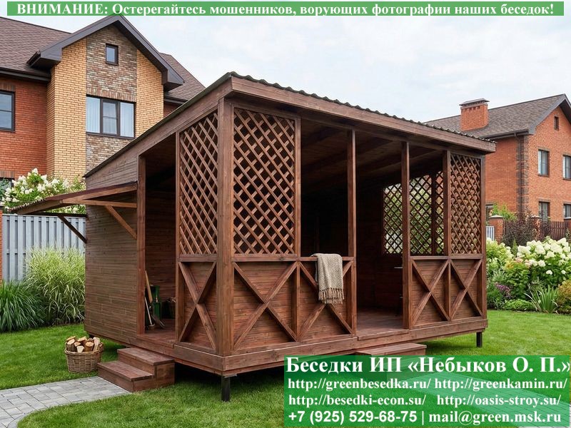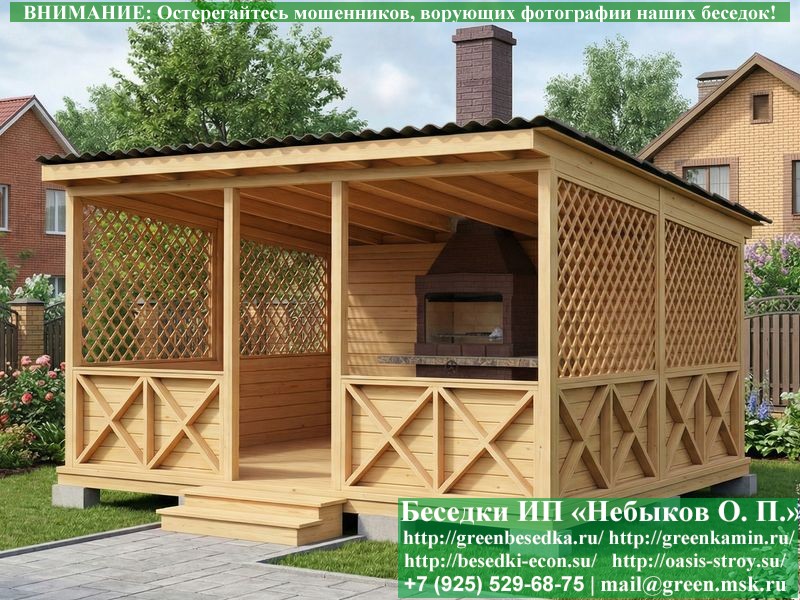 Деревянная односкатная беседка для дачи для дачи, загородного дома 4х5 метров изготавливается из сосны. При строительстве беседок используется сухой материал камерной сушки. Беседка устанавливается на полнотелые фундаментные блоки 20х20х40см. Они включены в цену. Фундаментные блоки можно заменить на металлические сваи. В качестве несущих стоек используется строганый брус 90х90 мм. В качестве каркаса стенок используется очень надежная имитация бруса 17х140 мм. В отличие от вагонки, она не гнется, не набухает и не идет трещинами. Ниже подоконника в беседку устанавливаются глухие деревянные кресты. Стандартно изготавливается беседка с глухой задней 5-ти метровой стенкой и открытой выше подоконника с 3-х сторон. Каждую сторону можно закрыть перголой (решеткой) или сделать глухой. Беседка строится с односкатной крышей. Угол наклона крыши можно сделать любым, но не менее 30 см. между задними и передними стойками. На крышу укладывается металлочерепица или профлист: Коричневых, Зеленых, Бордовых, Серых цветов. Срок изготовления и доставки беседок на участки составляет 5-10 дней. Беседки поставляются в не крашеном виде. Возможна покраска беседок в цеху или полная обработка антисептиком. Дополнительно предлагаем установку в деревянные беседки недорогих безопасных быстровозводимых печей-барбекю, установка в течение дня, или более дорогих и сложных комплексов-барбекю и мангалов-барбекю из кирпича.