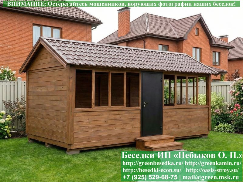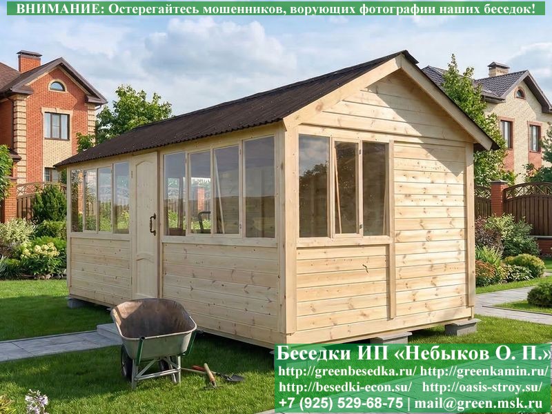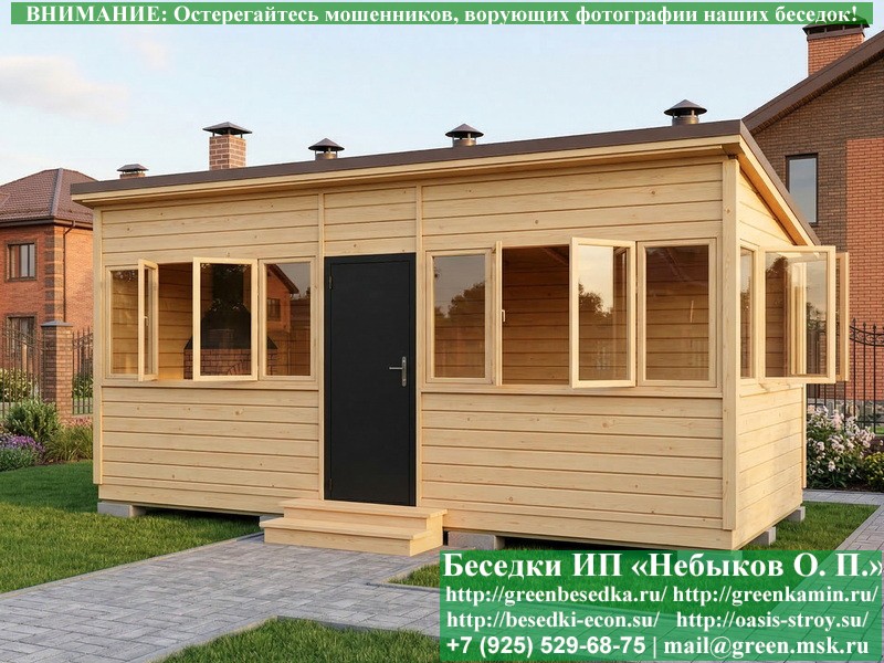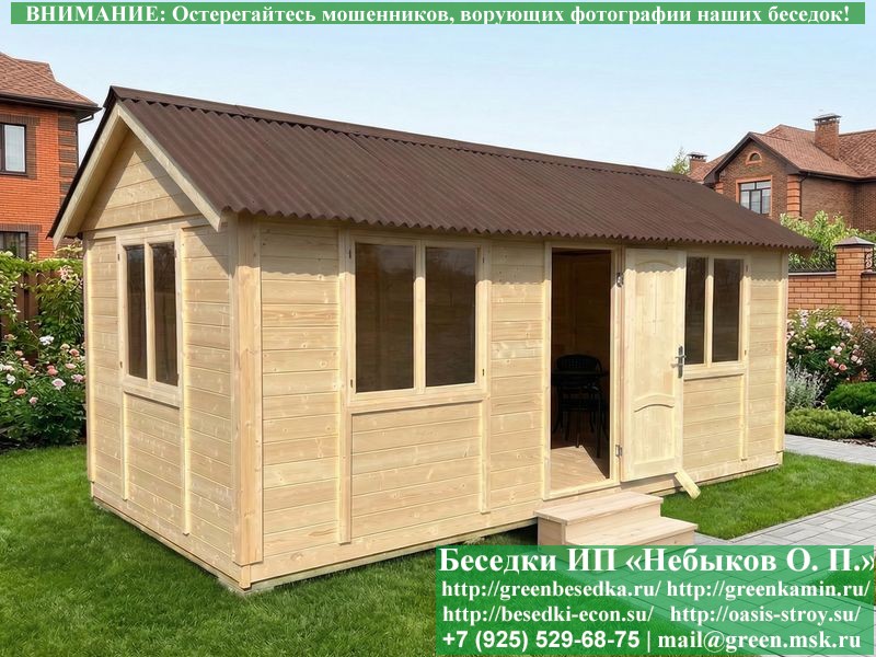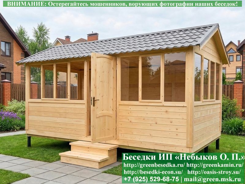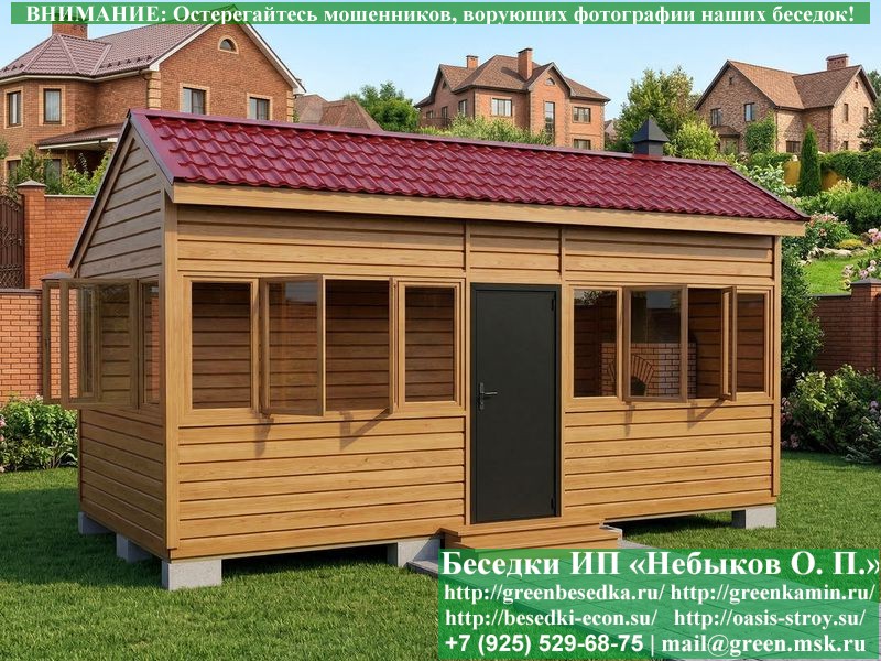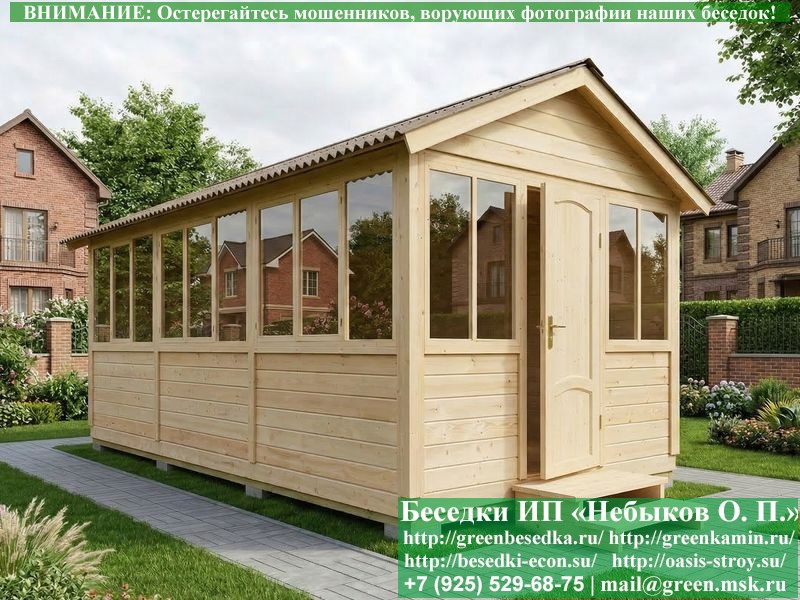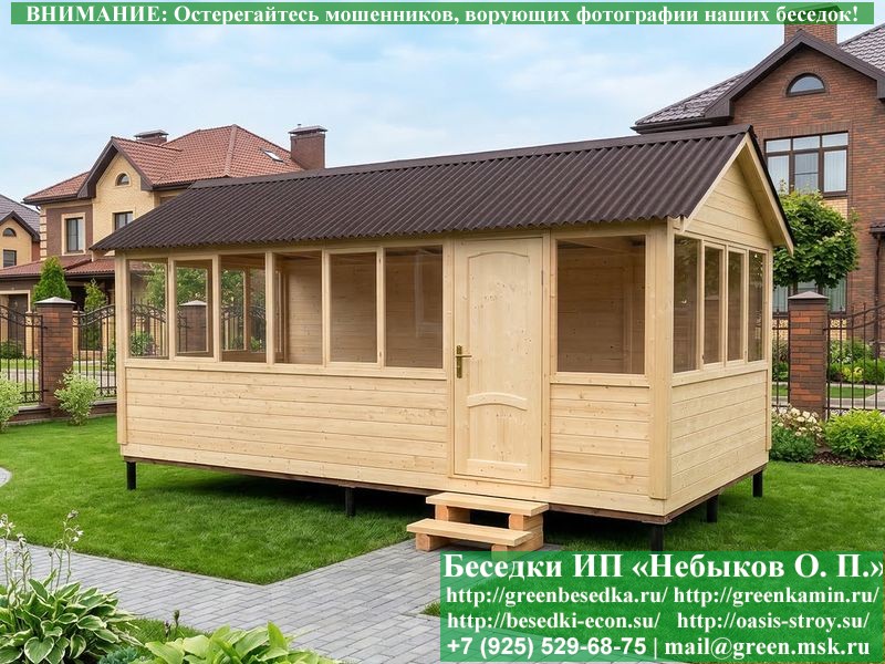 В цену входит беседка с глухой 6-ти метровой стенкой. Закрытая застекленная беседка для дачи, загородного дома, сада 3х6 метров изготавливается из сосны. При строительстве беседок используется сухой материал камерной сушки. В качестве каркаса беседки используется очень надежная имитация бруса 17х140 мм. В отличие от вагонки ее не выгибает, она не набухает и не идет трещинами. Усиленная конструкция крепления стоек. По углам ставится дополнительный строганый брус 90х90 мм. В беседку устанавливаются однорамные террасные деревянные окна. Толщина стекла 3 мм. Высота окон 110 см. Устанавливается сплошная деревянная филенчатая дверь. Дверь закупается в Лемана-Про, гарантии не подлежит. Дверь можно заменить на металлическую или алюминиевую. Окна и двери поставляются без фурнитуры (ручки и замки). Их можно установить дополнительно, по договоренности. На крышу беседки укладывается ондулин: Коричневых, Зеленых и Бордовых цветов. Ондулин можно заменить на металлочерепицу, мягкую черепицу или профлист. Срок изготовления и монтажа беседки на участке составляет 5-10 дней. Беседки поставляются в не крашеном вид. Возможна покраска беседок цеху или полная обработка антисептиком. Строительство деревянных закрытых застекленных беседок размерами 3х6 метров возможно в Москве, Московской, Тверской, Тульской, Калужской, Ярославской, Владимирской, Рязанской, Ивановской, Брянской, Костромской, Орловской, Смоленской, Новгородской, Липецкой, Ленинградской и некоторых других областях. Дополнительно предлагаем установку в деревянные застекленные беседки недорогих безопасных быстровозводимых печей-барбекю, установка в течение дня, или более дорогих и сложных комплексов-барбекю и мангалов-барбекю из кирпича.