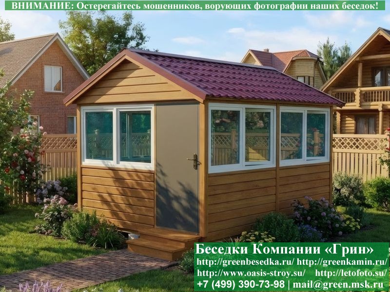 Закрытая застекленная беседка для дачи с пластиковыми окнами 3х4 метра. Беседка изготавливается из сосны. При строительстве беседок используется сухой материал камерной сушки. В качестве каркаса беседки используется очень надежная имитация бруса 17х140 мм. В отличие от вагонки, ее не выгибает, она не набухает и не идет трещинами. Используется усиленная конструкция крепления стенок. В качестве несущих стоек используется строганый брус, по углам 90х90 мм. Выше подоконника в беседку устанавливаются однокамерные пластиковы окна фирмы "Века". Окна заказываются в Лемана-про. Количество застекленных сторон и открывающихся окон - по договоренности. Устанавливается железная или алюминиевая дверь. Беседки изготавливаются с односкатной, двухскатной, четырехскатной крышей. На крышу кладется металлочерепица, мягкая черепица или профлист: Коричневых, Зеленых, Бордовых, Серых цветов. Срок изготовления и монтажа беседки на участке составляет 10-16 дней (Срок изготовления пластиковых окон). Беседки поставляются в не крашеном вид. Возможна покраска беседок или полная обработка антисептиком. Дополнительно предлагаем установку в деревянные беседки недорогих безопасных быстровозводимых печей-барбекю, установка в течение дня, или более дорогих и сложных комплексов-барбекю и мангалов-барбекю из кирпича. Строительство деревянных закрытых застекленных беседок с пластиковыми окнами размерами 3х4 метра возможно в Москве, Московской области, а так же в Тверской, Тульской, Калужской, Ярославской, Владимирской, Ивановской, Рязанской, Костромской, Брянской, Орловской, Смоленской, Липецкой, Ленинградской и некоторых других областях.