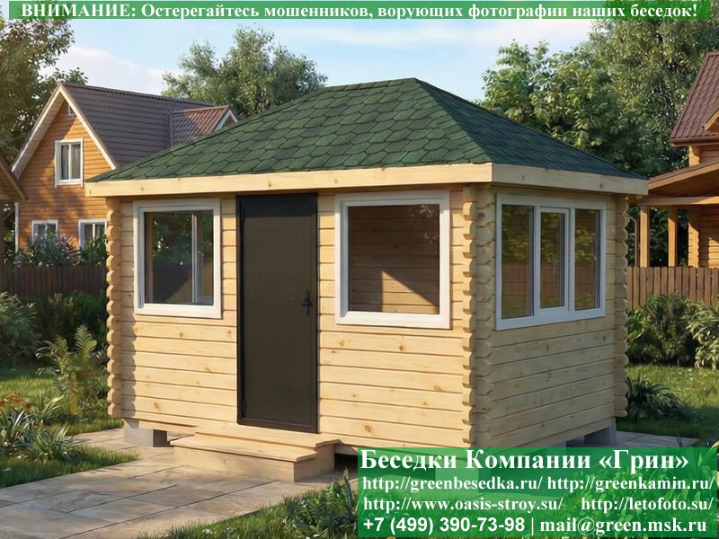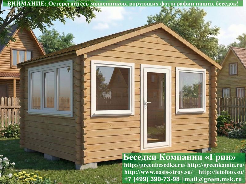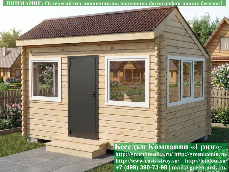 Застекленная беседка из минибруса 3х4 метра изготавливается из хвойных пород дерева. При строительстве беседок используется сухое дерево камерной сушки. Стенки беседки изготавливаются из сухого профилированного бруса 45х145 и 60х145 мм. На пол кладется толстая сухая строганая доска 35 мм. В беседку устанавливаются однокамерные пластиковые окна фирмы "Века". Окна заказываются в Лемана-Про. Количество застекленных сторон и количество открывающихся окон обговаривается дополнительно. Устанавливается железная или алюминиевая дверь. Беседки изготавливаются с односкатной, двухскатной, четырехскатной крышей. На крышу кладется металлочерепица, мягкая черепица или профлист: Коричневых, Зеленых, Бордовых, Серых цветов. Срок изготовления и установки беседки на участке составляет 10-14 дней (срок изготовление пластиковых окон). Беседки поставляются в не крашеном виде. Возможна покраска беседок в цеху или полная обработка антисептиком. Дополнительно предлагаем установку в деревянные беседки из минибруса с пластиковыми окнами недорогих безопасных быстровозводимых печей-барбекю, установка в течение дня, или более дорогих и сложных комплексов-барбекю и мангалов-барбекю из кирпича. Строительство деревянных закрытых застекленных беседок из минибруса с пластиковыми окнами размерами 3х4 метра возможно в Москве, Московской области, а так же в Тверской, Тульской, Калужской, Ярославской, Владимирской, Ивановской, Рязанской, Костромской, Брянской, Орловской, Смоленской, Липецкой, Ленинградской и некоторых других областях.