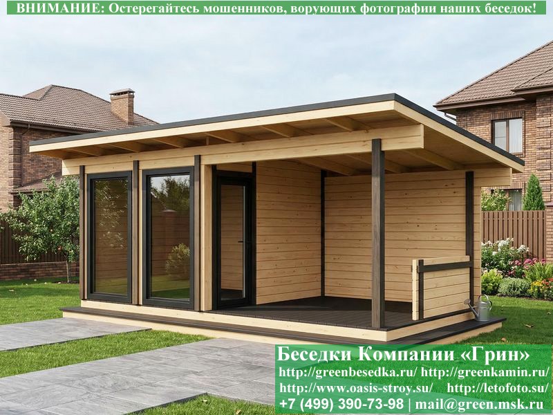 Застекленная беседка для дачи в современном стиле 'Лофт' 3х6 метров изготавливается из сосны, с односкатной крышей. При строительстве беседок используется сухой материал камерной сушки. Беседка разделена на 2 части. Комната 2х3 метра. Открытая веранда 3х4 метра. Возможно изменить конфигурацию. Беседка устанавливается на фундаментные блоки 20х20х40 см. Они включены в цену. Их можно дополнительно заменить на металлические сваи. В комнату устанавливаются однокамерные пластиковые окна-двери фирмы "Века" На пол кладется толстая сухая строганая доска 35 мм. В качестве несущих стоек используется строганый брус 90х90 мм. В качестве каркаса глухих стен используется очень надежная имитация бруса 17х140 мм. На крышу укладывается металлочерепица, мягкая черепица или профлист: Коричневых, Зеленых, Бордовых, Серых цветов. Срок изготовления и установки беседки на участке составляет 14-18 дней. Беседки поставляются в не крашеном виде. Возможна покраска беседок в цеху или полная обработка антисептиком. Строительство остекленных деревянных беседок в стиле 'Лофт' размерами 3х6 метров возможно в Москве, Московской, Тверской, Тульской, Калужской, Ярославской, Владимирской, Рязанской, Ивановской, Брянской, Костромской, Орловской, Смоленской, Новгородской, Липецкой, Ленинградской и некоторых других областях. Дополнительно предлагаем установку в деревянные беседки в современном стиле 'Лофт' недорогих безопасных быстровозводимых печей-барбекю, установка в течение дня, или более дорогих и сложных комплексов-барбекю и мангалов-барбекю из кирпича.