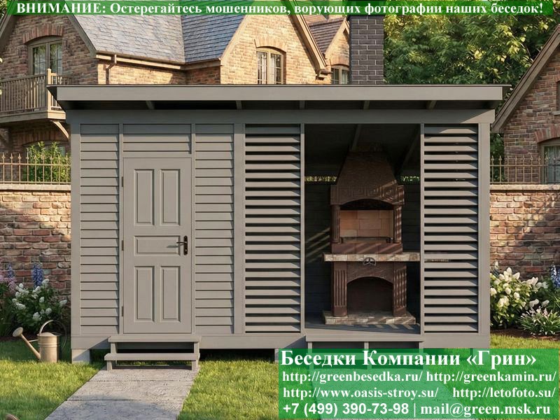 Беседка для дачи в современном стиле 'Лофт' 4х5 метров изготавливается из сосны, с односкатной крышей. Крышу можно заменить на сложную двухскатную. При строительстве беседок используется сухой материал камерной сушки. Беседка разделена на 2 части. Хозблок 2х3 метра. Веранда 3х3 метра. Беседка устанавливается на фундаментные блоки 20х20х40 см. Они включены в цену. Их можно дополнительно заменить на металлические сваи. Стенки беседки делаются в виде деревянных жалюзи. На пол кладется толстая сухая строганая доска 35 мм. В качестве несущих стоек используется строганый брус 90х90 мм. В качестве каркаса глухих стен используется очень надежная имитация бруса 17х140 мм. На крышу укладывается металлочерепица, мягкая черепица или профлист: Коричневых, Зеленых, Бордовых, Серых цветов. Срок изготовления и установки беседки на участке составляет 7-14 дней. Беседки поставляются в не крашеном виде. Возможна покраска беседок в цеху или полная обработка антисептиком. Строительство практичных деревянных беседок в стиле 'Лофт' размерами 4х5 метров возможно в Москве, Московской, Тверской, Тульской, Калужской, Ярославской, Владимирской, Рязанской, Ивановской, Брянской, Костромской, Орловской, Смоленской, Новгородской, Липецкой, Ленинградской и некоторых других областях. Дополнительно предлагаем установку в деревянные беседки в современном стиле 'Лофт' недорогих безопасных быстровозводимых печей-барбекю, установка в течение дня, или более дорогих и сложных комплексов-барбекю и мангалов-барбекю из кирпича.
