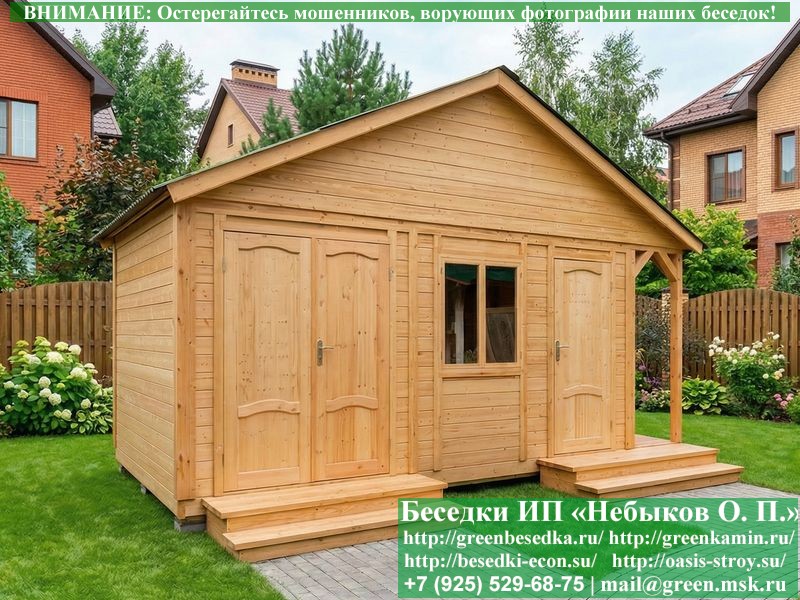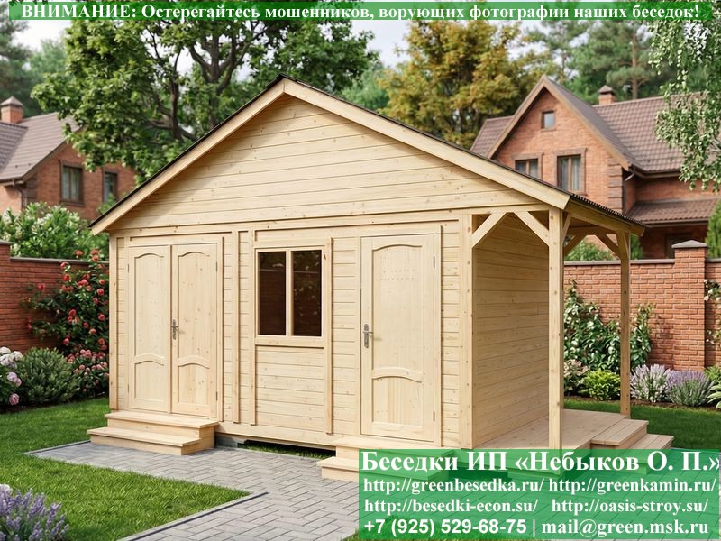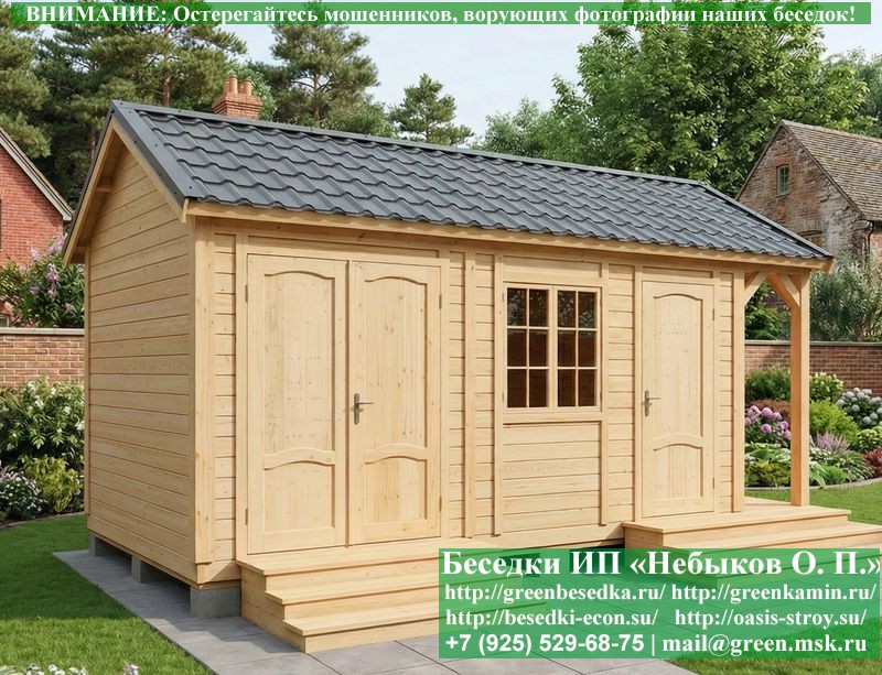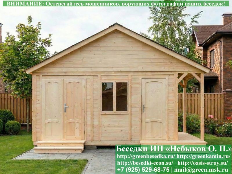 Деревянная бытовка-хозблок для дачи, загородного дома с дровником изготавливается из сосны. При строительстве используется сухое дерево камерной сушки. Бытовка разделена на 3 части. Хозблок 3х3 метра. Бытовка 2х3 метра. Дровник 1х3 метра. Возможно изменить размер и конфигурацию помещений. В качестве каркаса стен используется очень надежная имитация бруса 17х140 см. В отличие от вагонки, она не гнется, не набухает и не идет трещинами. Используется усиленная конструкция крепления стенок. По углам ставится дополнительный строганый брус 90х90 мм. На пол кладется толстая сухая строганая доска 35 мм. Бытовка изготавливается с 2-х скатной крышей с широким 6-ти метровым треугольником. Скаты направлены в сторону от дверей. На крышу укладывается Ондулин (Мягкий шифер): Коричневых, Зеленых, Бордовых, Серых цветов. Ондулин можно заменить на металлочерепицу, мягкую черепицу или профлист. Устанавливаются простые филенчатые двери. Двери закупаются в Лемана-Про и не подлежат замене по гарантии. Двери можно заменить на более надежные металлические или алюминиевые. В помещение бытовки устанавливается одно деревянное однослойное окно 100х110 см. Окно можно заменить на деревянное двухслойное (финки), пластиковое или алюминиевое. Бытовка-хозблок поставляется в не крашеном виде. Возможна покраска деревянного строения или полная обработка антисептиком. Срок изготовления и монтажа на участке составляет 5-10 дней.