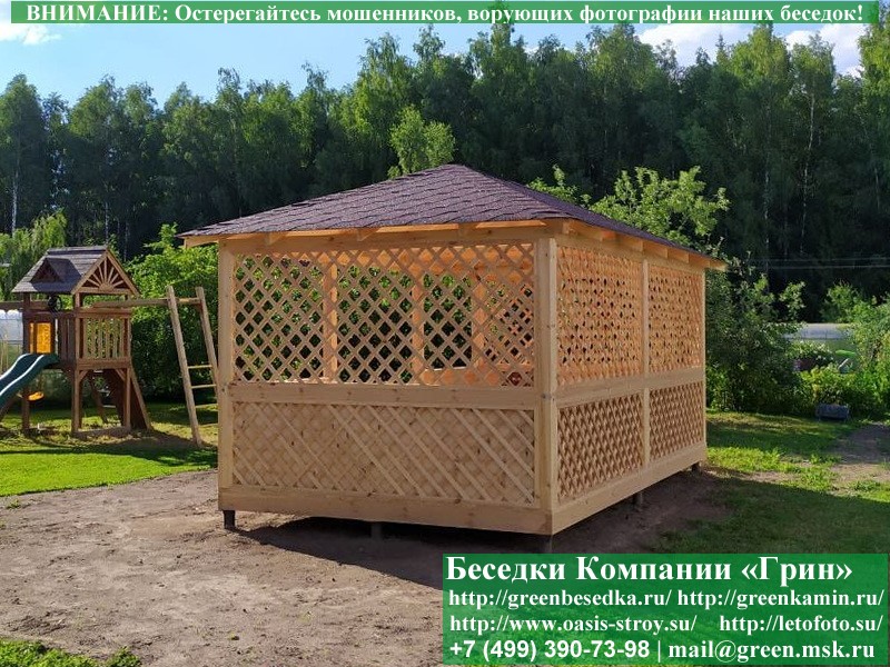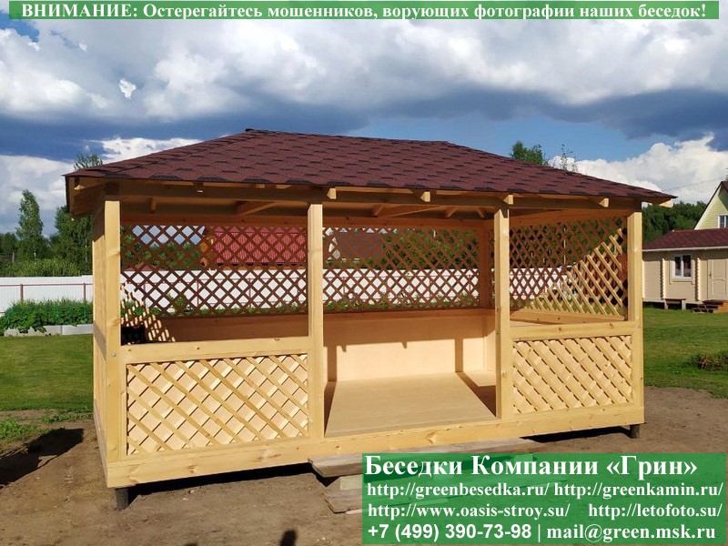 Красивая закрытая летняя деревянная беседка для дачи, загородного дома 3х5 метров. Фото и цены. В интернет-магазине 'Грин Беседка' вы можете купить элегантную закрытую летнюю деревянную беседку 3х4 на дачу недорого, под ключ. Летняя закрытая беседка для дачи 3х5 метров изготавливается из сосны, со сплошной одноярусной (вальмовой) крышей. При строительстве используется сухой материал камерной сушки. В качестве несущих стоек применяется строганый брус 90х90 мм. Стандартный вариант беседки: задняя стенка глухая. Ниже подоконника глухие перголы. Перголы с 2-х сторон выше подоконника. Возможно изменение конфигурации беседки. Перголы (решетки) закупаются у мастера, который занимается их изготовлением 15 лет. Сухой материал тщательно полируется. На крышу беседки укладывается гибкая черепица "Технониколь": Коричневых, Зеленых, Бордовых, Серых цветов. Возможна замена на металлочерепицу (около 50 тыс. руб.). Строительство закрытых летних деревянных беседок размерами 3х5 метров возможно в Тверской, Тульской, Калужской, Ярославской, Владимировской и некоторых других областях. Срок изготовления и монтажа беседки на участке 5-10 дней. Беседки поставляются в не крашеном виде. Возможна покраска беседок краской, лаком или обработка цветным антисептиком (недорогой вариант).