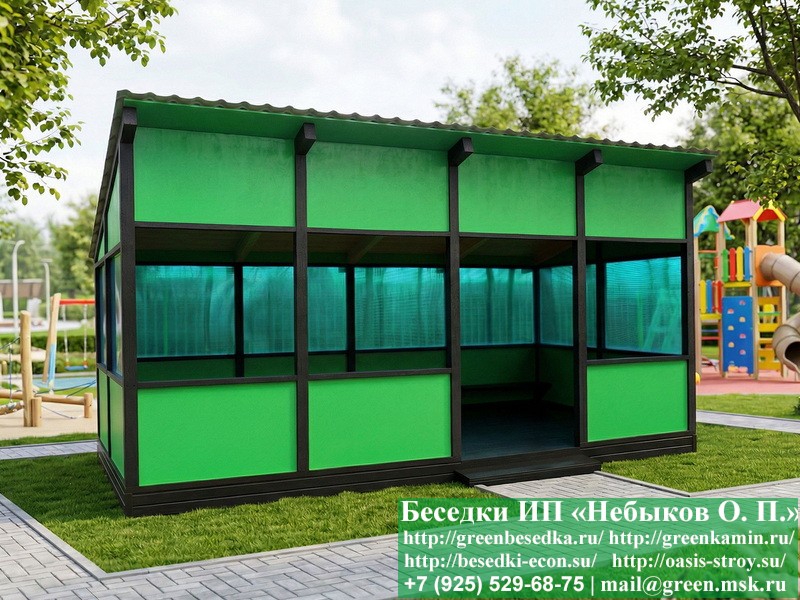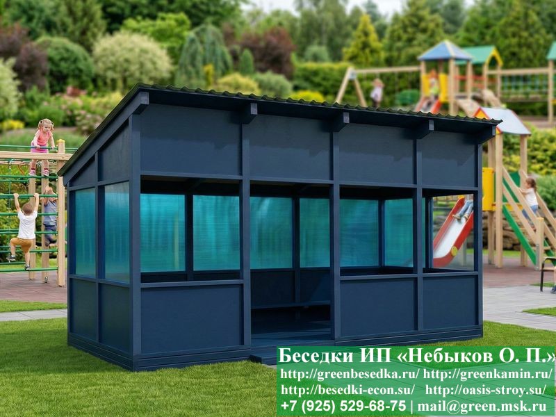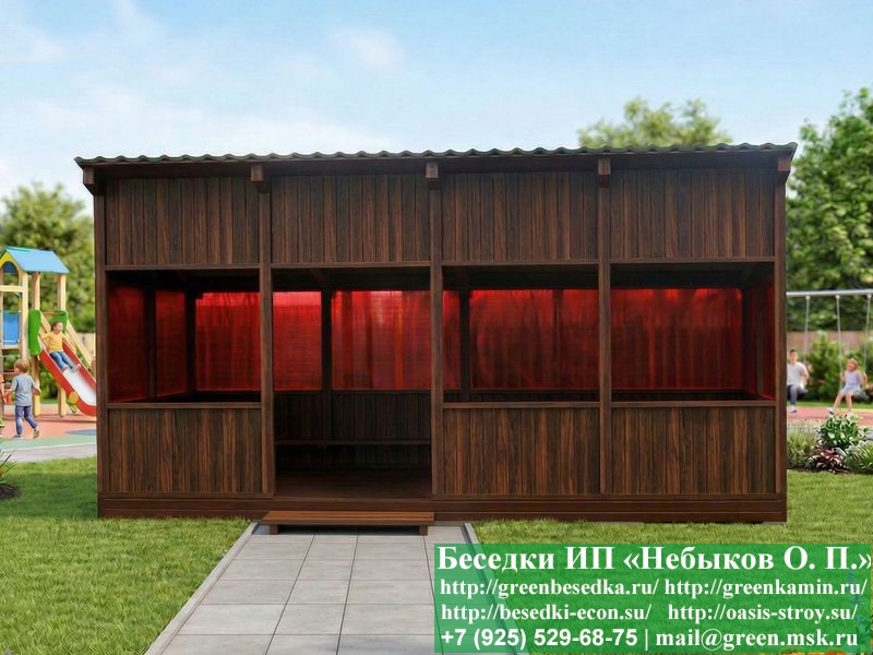 Красивая современная деревянная веранда для детского сада, детской площадки, школы 3х6 метров изготавливается из хвойных пород дерева. Возможно изготовление такой веранды с другими размерами. При строительстве веранды используется сухой материал камерной сушки. Веранда устанавливается на полнотелые фундаментные блоки 20х20х40 см. Блоки можно заменить на металлические сваи. На пол кладется толстая сух хая строганая доска 35 мм. В качестве несущих стоек используется брусок 45х90 мм. В качестве каркаса стен используется влагостойкая фанера. С 3-х сторон выше подоконника устанавливается монолитный поликарбонат различных цветовых оттенков. На крышу укладывается металлочерепица или профлист: Коричневых, Зеленых, Бордовых, Серых цветов. Срок изготовления и монтажа веранды составляет 7-14 дней. Веранда поставляется в не крашеном виде. Возможна покраска веранды в цеху или полная обработка антисептиком. Строительство деревянной веранды для детского сада, детской площадки, школы размерами 3х6 метров возможно в Москве, Московской, Тверской, Тульской, Калужской, Ярославской, Владимирской, Рязанской, Ивановской, Брянской, Костромской, Орловской, Смоленской, Новгородской, Липецкой, Ленинградской и некоторых других областях.