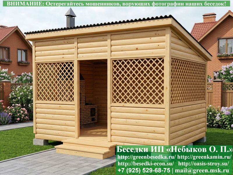 Простая садовая беседка для дачи 'Домик 3х4' изготавливается из сосны. При строительстве беседок используется сухой материал камерной сушки. В качестве каркаса беседки используется очень надежная имитация бруса 17х140 мм. В отличие от вагонки ее не выгибает, она не набухает и не идет трещинами. Усиленная конструкция крепления стенок. В качестве несущих стоек используется строганый брус. По углам 90х90 мм. Перголы (решетки) закупаются у мастера, который занимается их производством 15 лет. Сухой материал тщательно полируется. На крышу беседки укладывается ондулин: Коричневых, Зеленых и Бордовых цветов. Срок изготовления и монтажа беседки на участке составляет 5-10 дней. Беседки поставляются в не крашеном виде. Возможна покраска беседок краской, лаком или обработка цветным антисептиком (дешевый вариант). Дополнительно предлагаем установку в деревянные беседки недорогих безопасных быстровозводимых печей-барбекю, установка в течение дня, или более дорогих и сложных комплексов-барбекю и мангалов-барбекю из кирпича. Строительство простых садовых беседок размерами 3х4 метра возможно в Москве, Московской области, а так же в Тверской, Тульской, Калужской, Ярославской, Владимирской, Орловской, Костромской, Ивановской, Рязанской, Новгородской и некоторых других областях.
