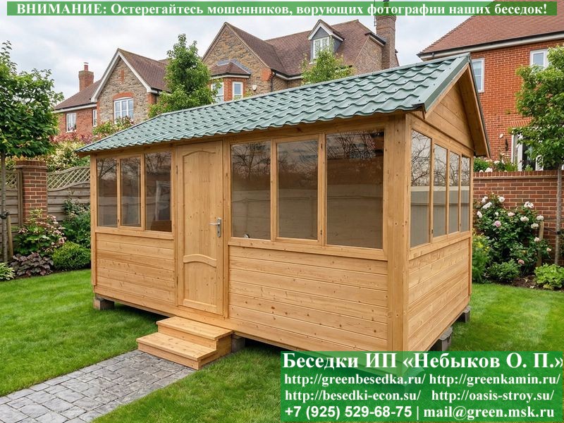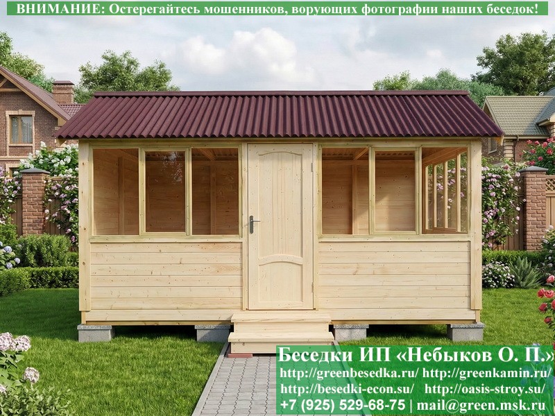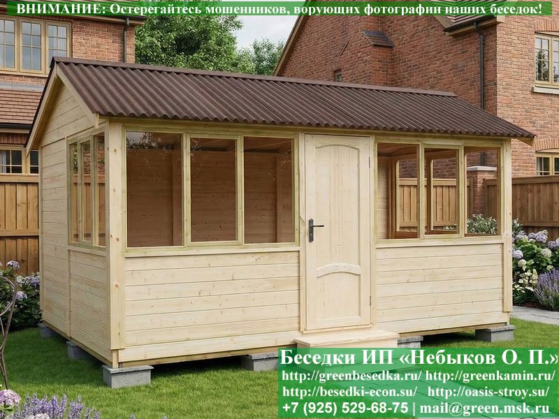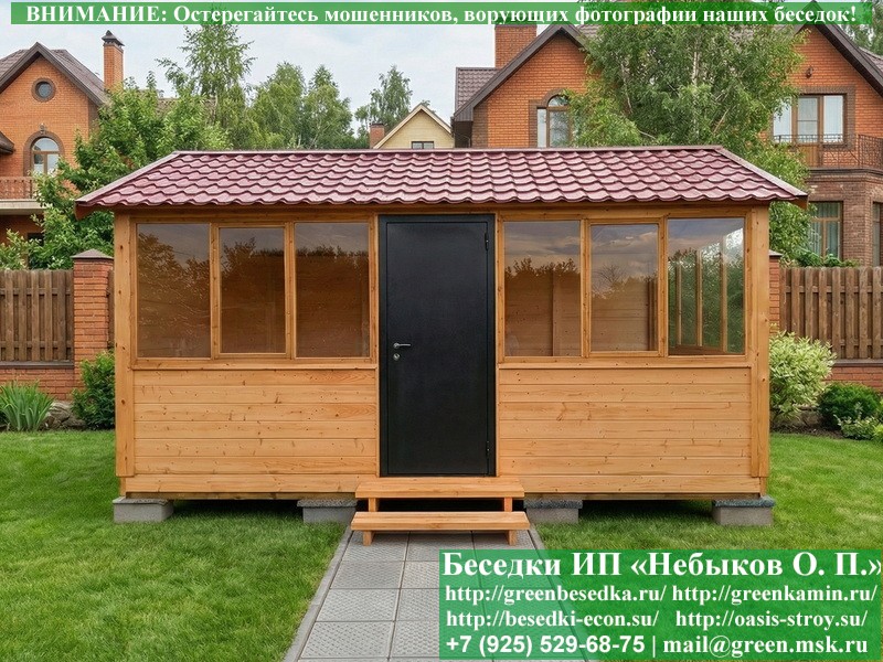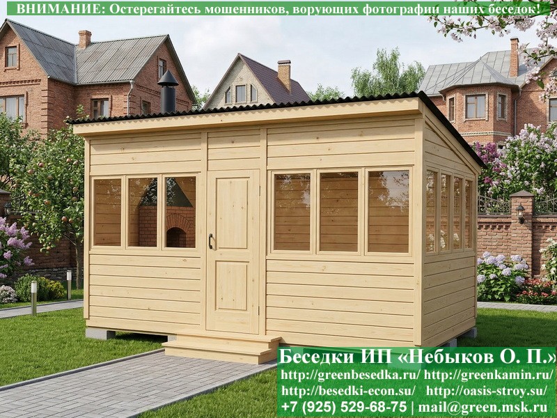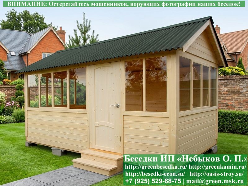 В цену входит беседка с глухой 5-ти метровой стенкой. Закрытая застекленная беседка для дачи, загородного дома, сада 3х5 метров изготавливается из сосны. При строительстве беседок используется сухой материал камерной сушки. В качестве каркаса беседки используется очень надежная имитация бруса 17х140 мм. В отличие от вагонки ее не выгибает, она не набухает и не идет трещинами. Усиленная конструкция крепления стоек. По углам ставится дополнительный строганый брус 90х90 мм. В беседку устанавливаются однорамные террасные деревянные окна. Толщина стекла 3 мм. Высота окон 110 см. Устанавливается сплошная деревянная филенчатая дверь. Дверь закупается в Лемана-Про, гарантии не подлежит. Дверь можно заменить на металлическую или алюминиевую. Окна и двери поставляются без фурнитуры (ручки и замки). Их можно установить дополнительно, по договоренности. На крышу беседки укладывается ондулин: Коричневых, Зеленых и Бордовых цветов. Ондулин можно заменить на металлочерепицу, мягкую черепицу или профлист. Срок изготовления и монтажа беседки на участке составляет 5-10 дней. Беседки поставляются в не крашеном вид. Возможна покраска беседок цеху или полная обработка антисептиком. Строительство деревянных закрытых застекленных беседок размерами 3х5 метров возможно в Москве, Московской, Тверской, Тульской, Калужской, Ярославской, Владимирской, Рязанской, Ивановской, Брянской, Костромской, Орловской, Смоленской, Новгородской, Липецкой, Ленинградской и некоторых других областях. Дополнительно предлагаем установку в деревянные застекленные беседки недорогих безопасных быстровозводимых печей-барбекю, установка в течение дня, или более дорогих и сложных комплексов-барбекю и мангалов-барбекю из кирпича.