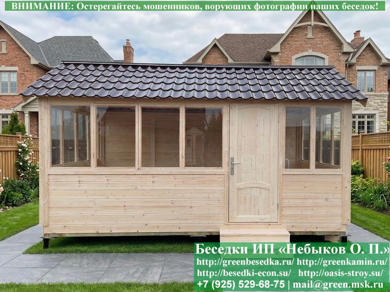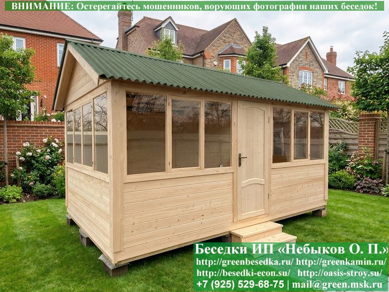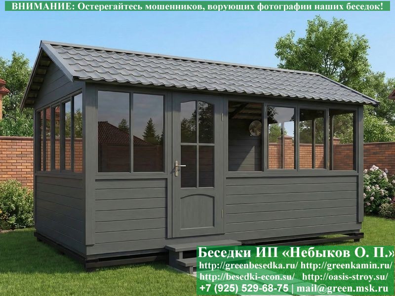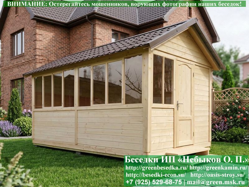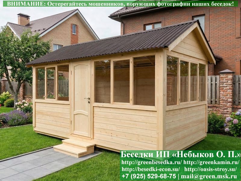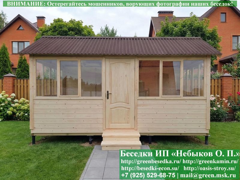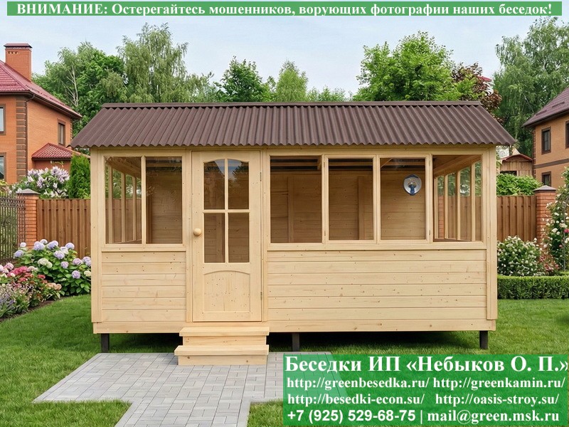 В цену входит беседка с глухой 5-ти метровой стенкой. Закрытая застекленная беседка для дачи, загородного дома, сада 3х5 метров изготавливается из сосны. При строительстве беседок используется сухой материал камерной сушки. В качестве каркаса беседки используется очень надежная имитация бруса 17х140 мм. В отличие от вагонки ее не выгибает, она не набухает и не идет трещинами. Усиленная конструкция крепления стоек. По углам ставится дополнительный строганый брус 90х90 мм. В беседку устанавливаются однорамные террасные деревянные окна. Толщина стекла 3 мм. Высота окон 110 см. Устанавливается сплошная деревянная филенчатая дверь. Дверь закупается в Лемана-Про, гарантии не подлежит. Дверь можно заменить на металлическую или алюминиевую. Окна и двери поставляются без фурнитуры (ручки и замки). Их можно установить дополнительно, по договоренности. На крышу беседки укладывается ондулин: Коричневых, Зеленых и Бордовых цветов. Ондулин можно заменить на металлочерепицу, мягкую черепицу или профлист. Срок изготовления и монтажа беседки на участке составляет 5-10 дней. Беседки поставляются в не крашеном вид. Возможна покраска беседок цеху или полная обработка антисептиком. Строительство деревянных закрытых застекленных беседок размерами 3х5 метров возможно в Москве, Московской, Тверской, Тульской, Калужской, Ярославской, Владимирской, Рязанской, Ивановской, Брянской, Костромской, Орловской, Смоленской, Новгородской, Липецкой, Ленинградской и некоторых других областях. Дополнительно предлагаем установку в деревянные застекленные беседки недорогих безопасных быстровозводимых печей-барбекю, установка в течение дня, или более дорогих и сложных комплексов-барбекю и мангалов-барбекю из кирпича.