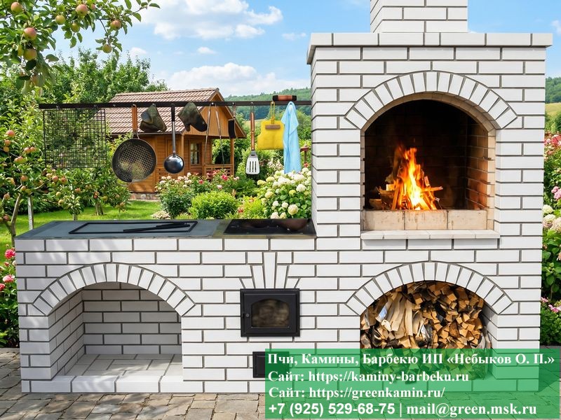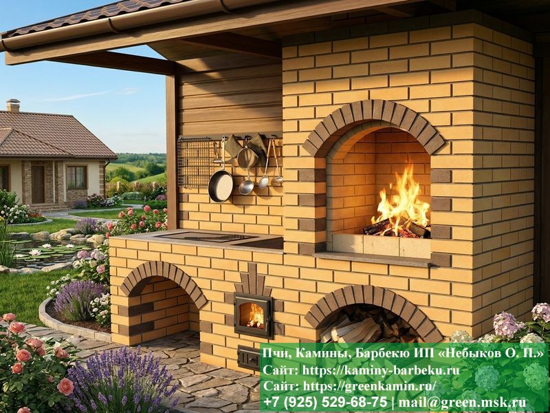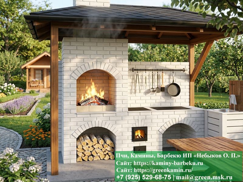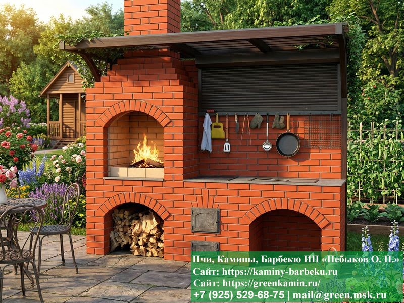 Представляем недорогой металлический навес для дачи или загородного дома под мангальную зону барбекю. Навес сделан из металлического профиля. Ширина навеса 2.2 метра. Крыша односкатная. Материал кровли - металлочерепица. Стенка навеса закрыта имитацией бруса. Под навесом установлен недорогой комплекс барбекю, на 3 модуля: Мангал барбекю, печь под казан и столешница с местом под дрова. Специальное предложение на зиму. Комплект: Комплекс-барбекю, Навес из металлического профиля и Бетонное основание (подушка) - всего за 250 тыс. руб.