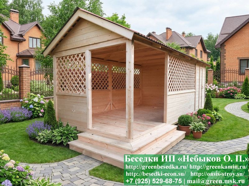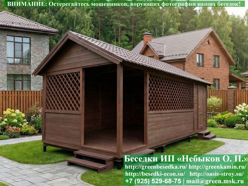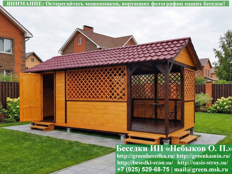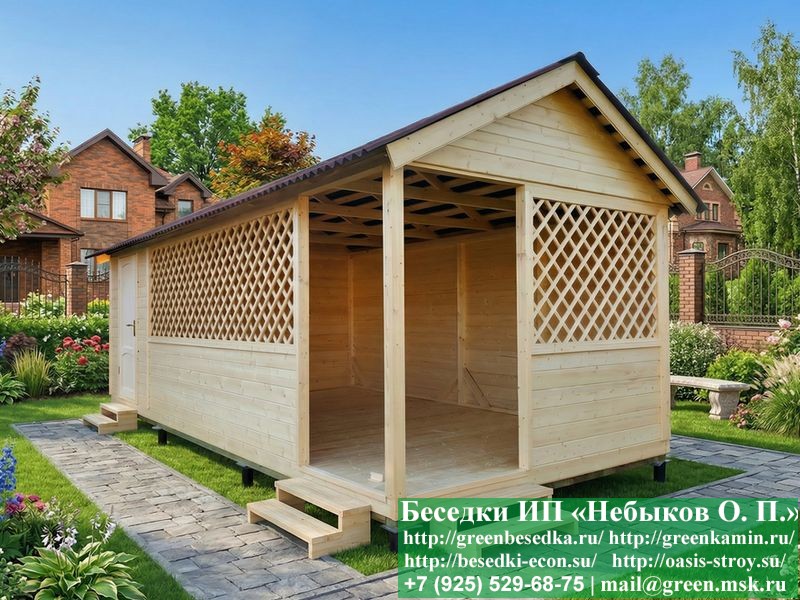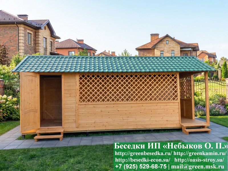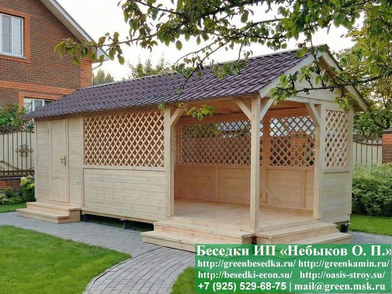 | Садовая беседка для дачи с хозблоком 3х7 метров. 7 метров глухая. Полузакрытая часть 3х5 или 3х4 метра. Хозблок 2х3 или 3х3 метра. Основание под кровлю — Глухая имитация бруса: | 400 000 руб. |