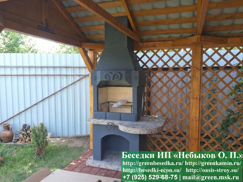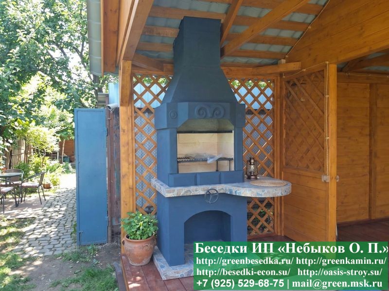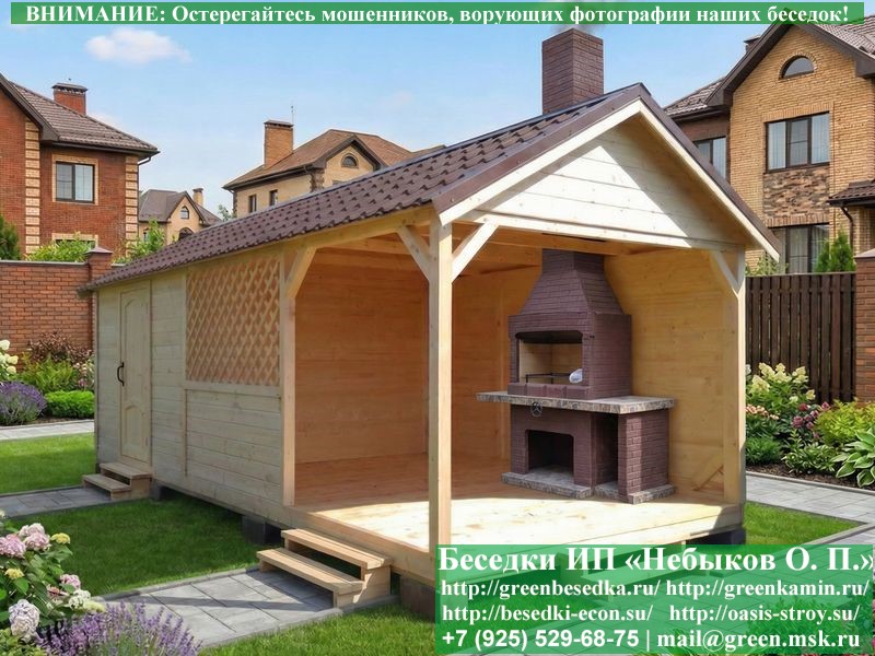 Полузакрытая беседка с хозблоком, сараем 3х7 метров изготавливается из сосны. При строительстве беседок используется сухой материал камерной сушки. Беседка разделена на 2 части: Полузакрытая часть 5х3 метра и хозблок 2х3 метра (можно сделать 4х3 +3х3). При строительстве беседок используется сухой материал камерной сушки. Беседка устанавливается на полнотелые фундаментные блоки 20х20х40 см. Они включены в цену. Блоки можно заменить на металлические сваи. В качестве каркаса беседки используется очень надежная имитация бруса 17х140 мм. В отличие от вагонки она не гнется, не набухает и не идет трещинами. Используется усиленная конструкция крепления стенок. По углам ставится дополнительный брус 90х90 мм. На пол кладется толстая сухая строганая доска 35 мм. На крышу беседки укладывается ондулин: Коричневых, Зеленых, Бордовых, Серых цветов. Срок изготовления и монтажа беседки на участке составляет 5-10 дней. Беседки поставляются в не крашеном виде. Возможна покраска беседок в цеху или полная обработка антисептиком. Строительство полезных деревянных беседок с хозблоком, сараем размерами 3х7 метров возможно в Москве, Московской, Тверской, Тульской, Калужской, Ярославской, Владимирской, Рязанской, Ивановской, Брянской, Костромской, Орловской, Смоленской, Новгородской, Липецкой, Ленинградской и некоторых других областях. Дополнительно предлагаем установку в садовые деревянные беседки с хозблоком недорогих безопасных быстровозводимых печей-барбекю, установка в течение дня, или более дорогих и сложных комплексов-барбекю и мангалов-барбекю из кирпича.