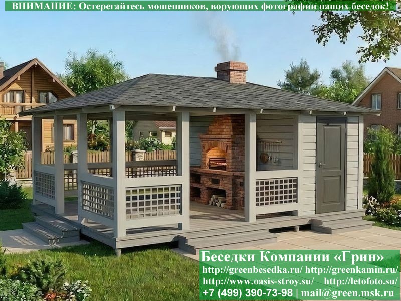 Элегантная летняя деревянная беседка для дачи с хозблоком 5х6 метров. Фото и цены. В интернет-магазине 'Грин Беседка' вы можете купить красивую деревянную летнюю беседку для дачи с хозблоком 5х6 под ключ. Летняя беседка для дачи с хозблоком 5х6 изготавливается из сосны, со сплошной одноярусной 4-х скатной крышей. В качестве несущих стоек используется строганый брус 90х90 или 140х140 мм. При строительстве используется сухое дерево камерной сушки. Беседка разделена на 2 части: открытая веранда 4х5 метров и хозблок 2х5 метров. На крышу беседки укладывается гибкая черепица "Технониколь": Коричневых, Зеленых, Бордовых, Серых цветов. Стандартно изготавливается открытая беседка, но каждую сторону беседки можно закрыть перголой (решеткой) до потолка. Строительство красивых, практичных летних беседок с хозблоком размерами 5х6 метров возможно в Москве, Московской области, а так же в Тверской, Тульской, Калужской, Ярославской, Владимирской и некоторых других областях. Срок изготовления и монтажа беседки на участке составляет 5-10 дней. Беседки поставляются в не крашеном виде. Возможна покраска беседок краской, лаком или обработка цветным антисептиком (недорогой вариант).