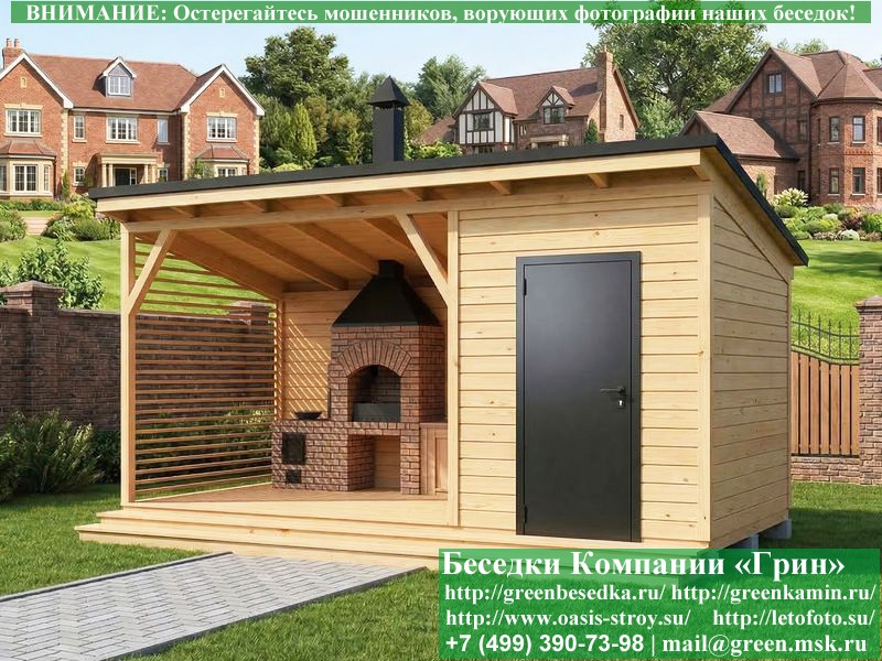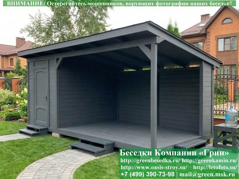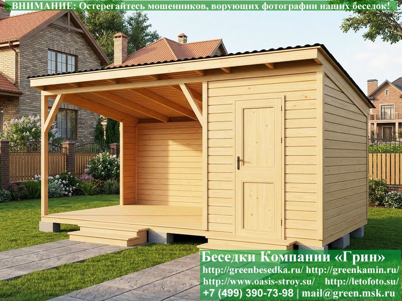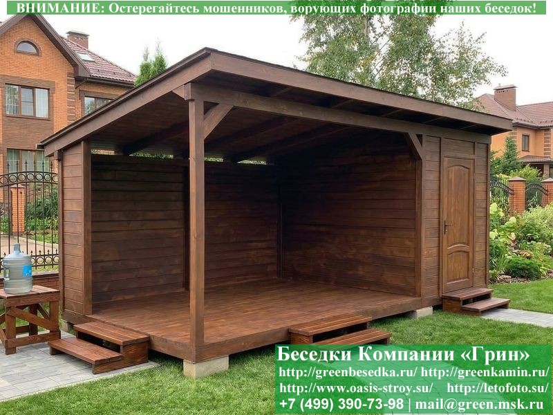 Беседка в стиле 'Лофт' 3х5, 3х6 метров изготавливается из сосны, с односкатной крышей. Крышу можно заменить на сложную двухскатную. При строительстве беседок используется сухой материал камерной сушки. Беседка разделена на 2 части. Хозблок 2х3 метра. Открытая веранда 3х3 или 3х4 метра. Возможно изменить конфигурацию. Сделать хозблок 3х3 метра. Беседка устанавливается на фундаментные блоки 20х20х40 см. Они включены в цену. Их можно дополнительно заменить на металлические сваи. На пол кладется толстая сухая строганая доска 35 мм. В качестве несущих стоек используется строганый брус 90х90 мм. В качестве каркаса глухих стен используется очень надежная имитация бруса 17х140 мм. На крышу укладывается металлочерепица, мягкая черепица или профлист: Коричневых, Зеленых, Бордовых, Серых цветов. Срок изготовления и установки беседки на участке составляет 5-10 дней. Беседки поставляются в не крашеном виде. Возможна покраска беседок или полная обработка антисептиком. Дополнительно предлагаем установку в деревянные беседки 'Лофт' недорогих безопасных быстровозводимых печей-барбекю, установка в течение дня, или более дорогих и сложных комплексов-барбекю и мангалов-барбекю из кирпича. Обратите внимание: даже сухое дерево нужно обязательно обрабатывать. Если не обрабатывать беседку, даже на сухом дереве могут появиться трещины и щели. Не такие огромные, как на влажном дереве, толщиной с палец. Но все равно неприятно. Трещины и щели могут появиться даже на сухом обработанном дереве. Такова природа этого материала. Но появление их на обработанных местах существенно ниже.