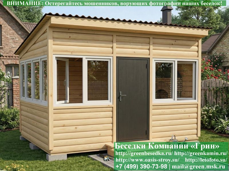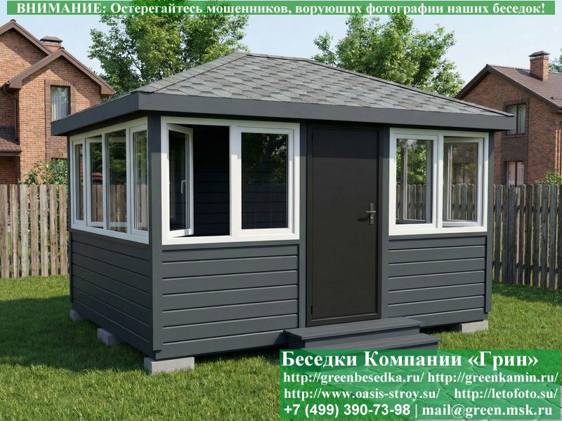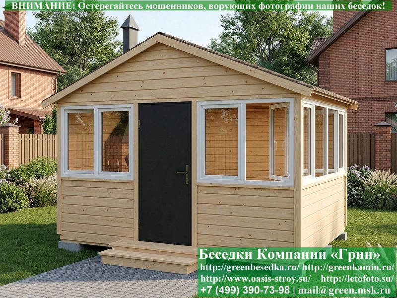 Закрытая застекленная беседка для дачи, загородного дома с пластиковыми окнами 3х4 метра изготавливается из сосны, по специальной каркасной технологии. При строительстве беседок используется сухой материал камерной сушки. В качестве каркаса беседки используется очень надежная имитация бруса 17х140 мм. В отличие от вагонки, она не гнется, не набухает и не идет трещинами. Имитацию бруса можно заменить на блокхаус (имитация бревна). Используется усиленная конструкция крепления стенок. По углам дополнительно устанавливается дополнительный брус 90х90 мм. На пол кладется толстая сухая строганая доска 35 мм (не шпунт). Пол обрабатывается антисептиком. Половую доску можно заменить на шпунтованную 36 мм или террасную доску ДПК. В беседку устанавливаются однокамерные пластиковые окна фирмы "Века". Окна заказываются в Лемана-Про. Количество застекленных сторон и количество открывающихся окон обговаривается дополнительно. Устанавливается железная, алюминиевая или пластиковая дверь. Беседки изготавливаются с односкатной, двухскатной, четырехскатной крышей. На крышу кладется металлочерепица, мягкая черепица или профлист: Коричневых, Зеленых, Бордовых, Серых цветов. Срок изготовления и монтажа беседки на участке составляет 14-18 дней (срок изготовление пластиковых окон). Беседки поставляются в не крашеном виде. Возможна покраска беседок в цеху или полная обработка антисептиком. Строительство деревянных закрытых застекленных беседок с пластиковыми окнами размерами 3х4 метра возможно в Москве, Московской, Тверской, Тульской, Калужской, Ярославской, Владимирской, Ивановской, Рязанской, Костромской, Брянской, Орловской, Смоленской, Липецкой, Ленинградской и некоторых других областях. Дополнительно предлагаем установку в деревянные беседки с алюминиевыми окнами недорогих безопасных быстровозводимых печей-барбекю, установка в течение дня, или более дорогих и сложных комплексов-барбекю и мангалов-барбекю из кирпича.