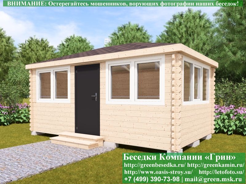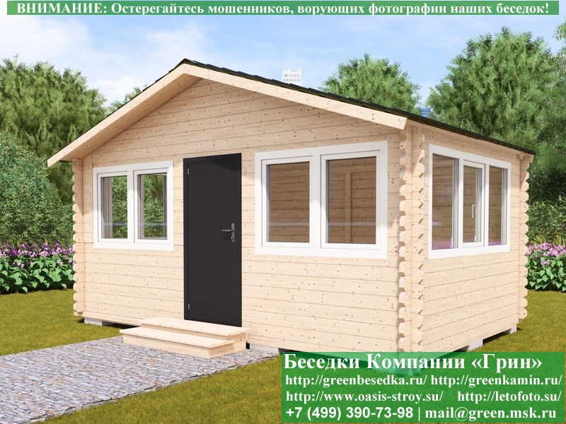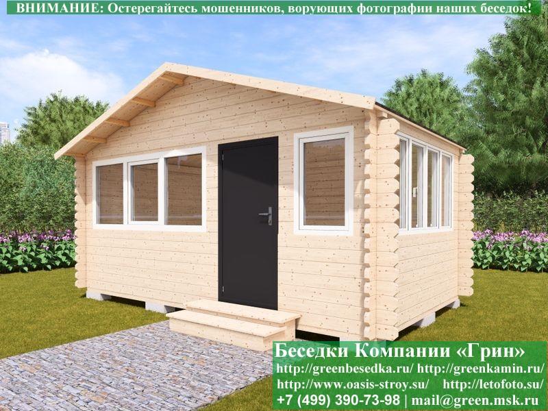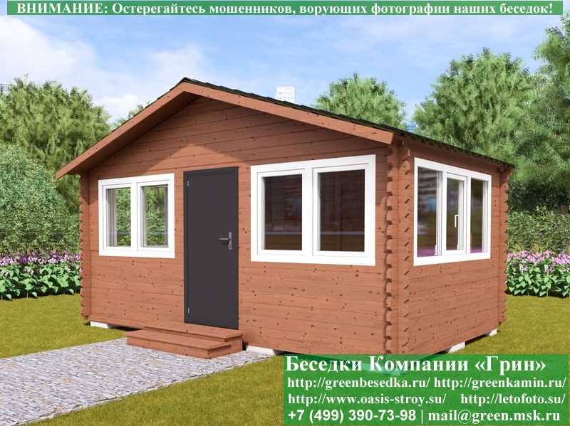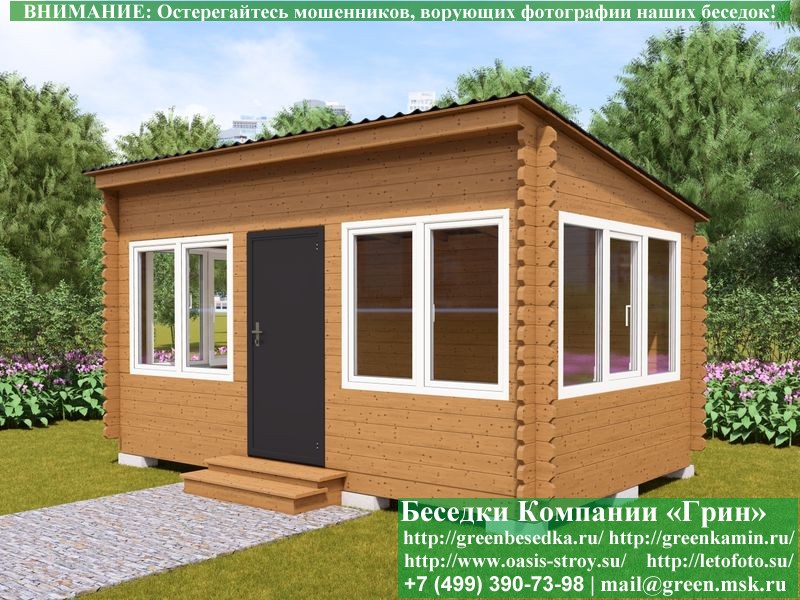 Застекленная беседка из минибруса 3х5 метров изготавливается из хвойных пород дерева. При строительстве беседок используется сухое дерево камерной сушки. Стенки беседки изготавливаются из сухого профилированного бруса 45х145 и 60х145 мм. На пол кладется толстая сухая строганая доска 35 мм. В беседку устанавливаются однокамерные пластиковые окна фирмы "Века". Окна заказываются в Лемана-Про. Количество застекленных сторон и количество открывающихся окон обговаривается дополнительно. Устанавливается металлическая или алюминиевая дверь. Беседки изготавливаются с Односкатной, 2-х и 4-х скатной крышей. На крышу кладется Металлочерепица, Мягкая черепица или Профлист: Коричневых, Зеленых, Бордовых, Серых цветов. Срок изготовления и установки беседки на участке составляет 10-14 дней (срок изготовление пластиковых окон). Беседки поставляются в не крашеном виде. Возможна покраска беседок в цеху или полная обработка антисептиком. Дополнительно предлагаем установку в деревянные беседки с пластиковыми окнами недорогих безопасных быстровозводимых печей-барбекю, установка в течение дня, или более дорогих и сложных комплексов-барбекю и мангалов-барбекю из кирпича. Обратите внимание: даже сухое дерево нужно обязательно обрабатывать. Если не обрабатывать беседку, даже на сухом дереве могут появиться трещины и щели. Не такие огромные, как на влажном дереве, толщиной с палец. Но все равно неприятно. Трещины и щели могут появиться даже на сухом обработанном дереве. Такова природа этого материала. Но появление их на обработанных местах существенно ниже.