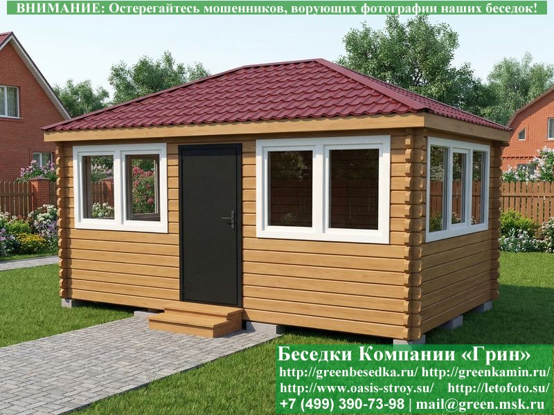 Застекленная беседка из минибруса 3х5 метров изготавливается из хвойных пород дерева. При строительстве беседок используется сухое дерево камерной сушки. Стенки беседки изготавливаются из сухого профилированного бруса 45х145 и 60х145 мм. На пол кладется толстая сухая строганая доска 35 мм. В беседку устанавливаются однокамерные пластиковые окна фирмы "Века". Окна заказываются в Лемана-Про. Количество застекленных сторон и количество открывающихся окон обговаривается дополнительно. Устанавливается железная или алюминиевая дверь. Беседки изготавливаются с односкатной, двухскатной, четырехскатной крышей. На крышу кладется металлочерепица, мягкая черепица или профлист: Коричневых, Зеленых, Бордовых, Серых цветов. Срок изготовления и установки беседки на участке составляет 10-14 дней (срок изготовление пластиковых окон). Беседки поставляются в не крашеном виде. Возможна покраска беседок в цеху или полная обработка антисептиком. Дополнительно предлагаем установку в деревянные беседки из минибруса с пластиковыми окнами недорогих безопасных быстровозводимых печей-барбекю, установка в течение дня, или более дорогих и сложных комплексов-барбекю и мангалов-барбекю из кирпича. Строительство деревянных закрытых застекленных беседок из минибруса с пластиковыми окнами размерами 3х4 метра возможно в Москве, Московской области, а так же в Тверской, Тульской, Калужской, Ярославской, Владимирской, Ивановской, Рязанской, Костромской, Брянской, Орловской, Смоленской, Липецкой, Ленинградской и некоторых других областях.