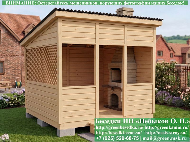 Простая садовая беседка для дачи 'Домик 3х3' изготавливается из сосны. При строительстве беседок используется сухой материал камерной сушки. Беседка устанавливается на полнотелые фундаментные блоки 20х20х40 см. Они включены в цену. Фундаментные блоки можно заменить на металлические сваи. В качестве каркаса беседки используется очень надежная имитация бруса 17х140 мм. В отличие от вагонки ее не выгибает, она не набухает и не идет трещинами. Используется усиленная конструкция крепления стенок. По углам ставится дополнительный строганый брус 90х90 мм. Выше подоконника устанавливаются пергол (решетки) с косыми ячейками. Перголы закупаются у мастера, который занимается их изготовлением 15 лет. Сухой материал тщательно полируется. На пол укладывается толстая сухая строганая доска 35 мм. На крышу беседки укладывается ондулин (мягкий шифер): Коричневых, Зеленых, Бордовых, Серых цветов. Срок изготовления и монтажа беседки на участке составляет 5-10 дней. Беседки поставляются в не крашеном виде. Возможна покраска беседок краской, лаком или полная обработка антисептиком. Строительство простых деревянных беседок 'Домик' размерами 3х3 метра возможно в Москве, Московской, Тверской, Тульской, Калужской, Ярославской, Владимирской, Рязанской, Ивановской, Брянской, Костромской, Орловской, Смоленской, Новгородской, Липецкой, Ленинградской и некоторых других областях. Дополнительно предлагаем установку в деревянные садовые беседки 'Домик' недорогих безопасных быстровозводимых печей-барбекю, установка в течение дня, или более дорогих и сложных комплексов-барбекю и мангалов-барбекю из кирпича.