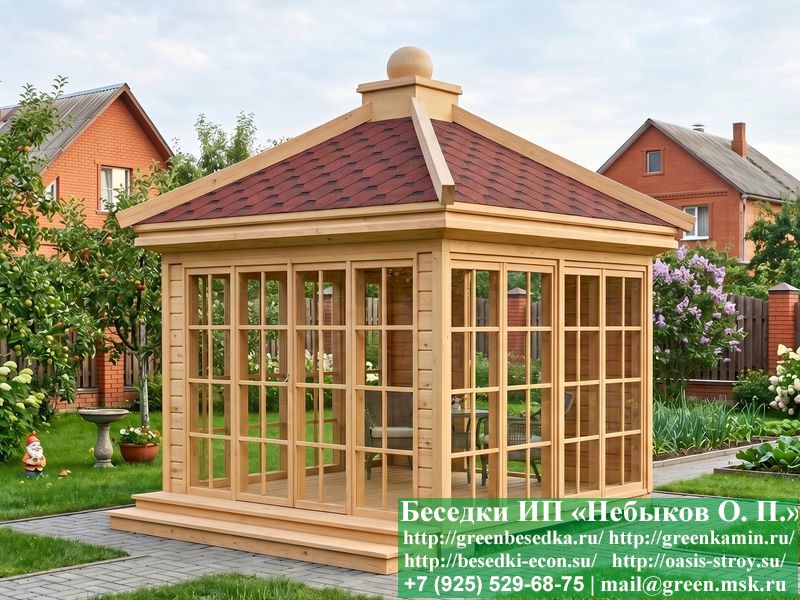 Красивый, оригинальный застекленный чайный домик 'Кикуэ' изготавливается из сосны. При строительстве беседок используется сухой материал камерной сушки. На пол кладется толстая сухая строганая доска 35 мм (не шпунт). Пол обрабатывается антисептиком. Половую доску можно заменить на шпунтованную 36 мм или террасную доску ДПК. В качестве несущих стоек используется строганый брус 90х90 мм. Глухие стенки закрываются надежной имитацией бруса 17х140 мм. В отличие от вагонки, она не гнется, не набухает и не идет трещинами. В беседку, чайный домик устанавливаются деревянные однорамные панорамные окна. Стандартно чайный домик 'Кикуэ' изготавливается с одним входом (2 дверцы по 65-70 см). Можно сделать дополнительные входа в эту же цену. Чайный домик изготавливается со сложной четырехскатной крышей. На крышу укладывается мягкая черепица "Технониколь": Коричневых, Зеленых, Бордовых, Серых цветов. Срок изготовления и монтажа чайного ломика на участке составляет 7-14 дней. Строительство красивых, необычных закрытых чайных домиков возможно в Москве, Московской, Тверской, Тульской, Калужской, Ярославской, Владимирской, Рязанской, Ивановской, Брянской, Костромской, Орловской, Смоленской, Новгородской, Липецкой, Ленинградской и некоторых других областях. Дополнительно предлагаем установку в деревянные закрытые застекленные беседки, чайные домики недорогих безопасных быстровозводимых печей-барбекю, установка в течение дня, или более дорогих и сложных комплексов-барбекю и мангалов-барбекю из кирпича.